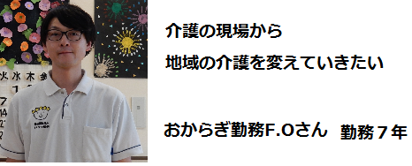 いつつ星会に勤めてから福祉を勉強していますが、福祉だけでは介護や自立支援について出来る事が限られてくると感じ、現実と理想のギャップに悩む事もあります。しかし、おからぎにいらっしゃるご高齢者さまやご家族と交流する事で信頼関係を築き、本当に今必要としていることを身近で体験し、自分自身も 成長しながら、地域に目を向けた介護を考えられるようになり、その体験を基に、新しい地域介護サービス をご提供できることにやりがいに感じています。