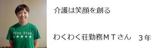 いつつ星会で働く介護の先輩たちは熱い志を持ち、1人1人明確な目標をもって働いています。そんな熱い先輩たちから、これから介護の仕事を考えている、又は興味がある後輩にむけて、実際の職場環境や介護の仕事、1人1人の思い描く介護に対する思いをインタビュー形式でご紹介いたします。